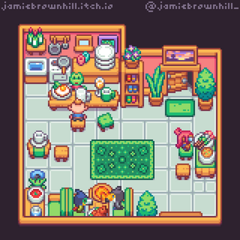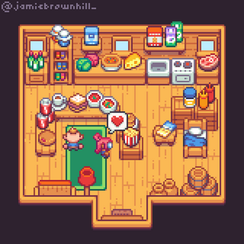 this art is soooo cute and makes such good use of shapes and colours to make objects distinct at such a tiny resolution. im not using them directly but i do reference them while i make my own pixel art